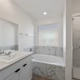 The primary suite offers vaulted ceilings and cozy carpet, creating a relaxing retreat. The primary bathroom includes a dual vanity with quartz countertops, along with a separate shower and soaking tub. Secondary bedrooms are well-sized and versatile for guests, a home office, or additional living space.
