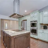 • Tall custom cabinetry with pull-out pantries, crown molding, and under-cabinet lighting