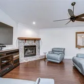 • Family room features a striking stone-surround wood-burning fireplace, vaulted ceilings, crown molding, and recessed lighting