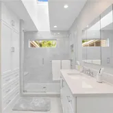 The spacious primary suite includes a modern bath with a large walk-in shower and matching cabinetry.