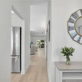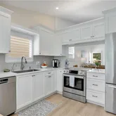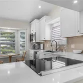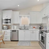 The custom kitchen by Ambiance Kitchen Designs features white cabinetry, quartz countertops, and stainless-steel appliances. Both bathrooms have been tastefully updated, and the bedrooms include custom built-in cabinetry for extra storage. Other upgrades include fresh paint, and luxury vinyl flooring.