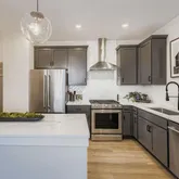 Chef kitchen with vented hood and 42" maple shaker Adriactic...Move-In Ready December – Brand-New 3-Bedroom rare end unit Townhome! Welcome to your new home in a dynamic, walkable urban community! This stunning 3-bedroom, 3.5-bath, 3-story townhome offers over 1,896 sq ft of thoughtfully designed living space with modern finishes throughout. Key Features: