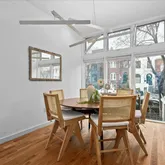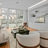 Stepping into this home, you’re immediately enveloped in its openness, warmth and elegance. Wide plank white oak flooring flows throughout, enhancing the home's modern allure. Just off the entry, is the dining space with its stunning Ingo Maurer light fixture setting the stage for memorable dinners. Just off the dining room is heart of the home, a breathtaking 22-foot kitchen featuring integrated Thermador and Bosch appliances seamlessly paired with custom-paneled cabinetry. The expansive island, adorned with quartz counters and waterfall edges, invites culinary creativity and offers ample seating for entertaining. The separate dining space just off Bathed in natural light through floor-to-ceiling windows and graced by 10-foot ceilings, the living space exudes a sleek sophistication, with its custom built-in cabinetry, ideal for displaying your finest collections. A half bathroom is tucked away just off the living room. The landscaped private yard has two outside get-a-aways on each level. Off the living room is a walkway leading you to private outdoor space where you could gather around a fire pit for a relaxing evening.