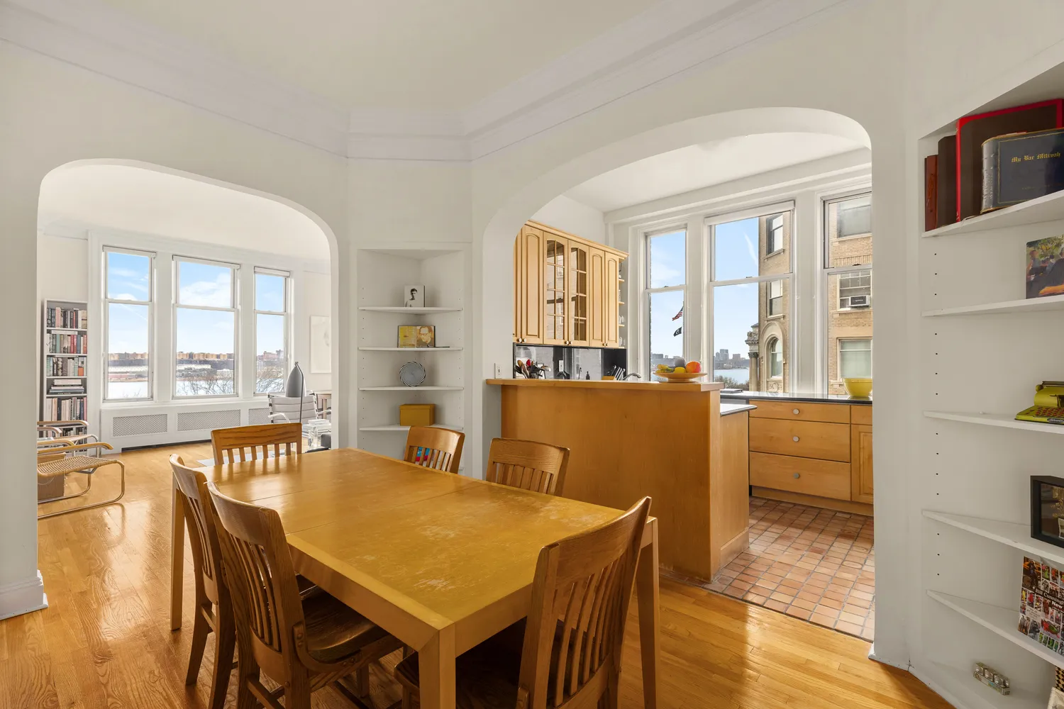 An entry gallery with three large closets leads to the large corner living room with spectacular views from oversized windows of the Hudson River, Riverside Park, and the Soldiers' and Sailors’ Monument. The windowed kitchen, with equally impressive views, has generous storage and counter space, stainless steel appliances and a washer/dryer. It opens onto a separate dining area with seating for six.