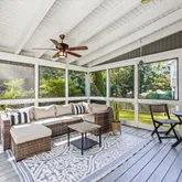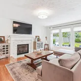 Step inside, and you'll find a freshly painted haven adorned with new hardwood flooring across all three levels. The gourmet kitchen is a chef's dream, featuring stainless steel appliances, double wall ovens, a 5-burner gas cooktop, built-in microwave, and exquisite quartz waterfall countertops—an entertainer's paradise. The main level effortlessly combines functionality and style, boasting a formal living room( currently used as a darling playroom), a bright breakfast nook, a cozy family room, and an upgraded half bath. The mix of hardwood and engineered hardwood flooring throughout the main level adds warmth and character. Off the kitchen, a spacious screened-in porch awaits, complete with vaulted ceilings and a ceiling fan. Beyond lies a beautifully hardscaped patio with a firepit, set against a fully fenced, private, and generously sized backyard. The pièce de résistance? A 2-year-old jacuzzi tub, perfect for year-round relaxation. Bedroom Retreats:
