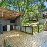 The lower level offers excellent potential to create additional living or entertainment space tailored to your needs. Multiple tiers of decking provide inviting outdoor living areas, ideal for relaxing or hosting while soaking in the views. Steps lead down to the lower deck and floating dock, equipped with a 6,000 lb boat lift for added convenience and protection.