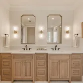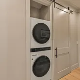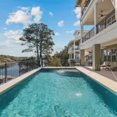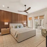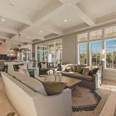 This impeccably designed residence features eight generously proportioned bedrooms, each with elegantly appointed en-suite bathrooms. Designed to embody the essence of a luxurious coastal lake house, the interiors reflect a soft, natural color palette and neutral tones, curated with high-end furnishings. Upon entering, guests are greeted by a spacious great room with an additional sitting area, a wet bar complete with a wine fridge and ice maker, and large sliding doors that lead to the expansive first-level outdoor living space and oversized private pool. This level also includes one of the home's two primary suites, offering direct access to the covered outdoor space, as well as a second guest bedroom for added convenience.