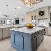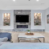The open-concept family room features a modern electric fireplace and flows directly to the covered terrace. The chef’s kitchen includes a large island, extended counter seating, and seamless connection to the main living areas.