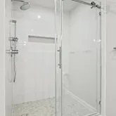 Both bathrooms completely renovated a few years ago, with large walk-in showers, gleaming glass doors, marble-top vanities, and chrome fixtures