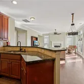 - Kitchen Features: Breakfast Bar, Cabinets Stain, Kitchen Island, Pantry, Stone Counters, View to Family Room