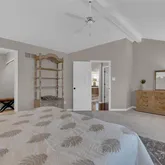 Both bedrooms are located on the main level. The primary suite is generously sized with a bay window, plantation shutters, vaulted ceiling, ceiling fan, neutral paint, and carpeting. The en-suite bath features double vanities, a separate soaking tub, and separate shower, both with glass enclosures. The guest bedroom includes a large window and ample closet space.