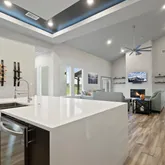 Chef’s kitchen opening to a spacious living area with stunning views of your backyard oasis