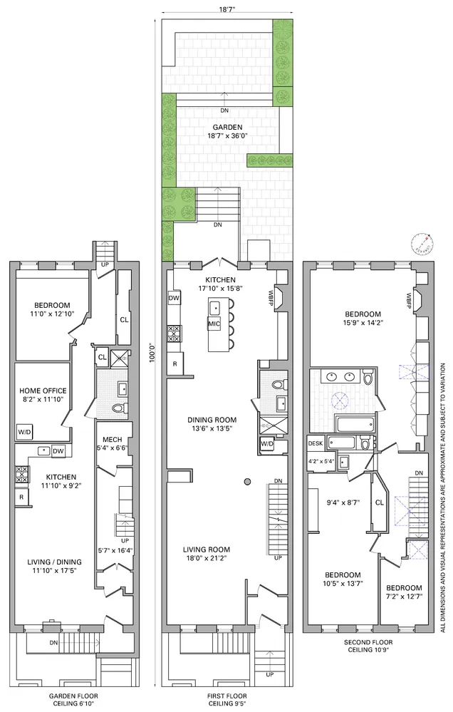 Measuring 18.75 ft × 60 ft on a 100 ft lot, this two-family residence offers 3,225 sq ft of finished living space, including a spectacular owner’s 3-bed/3-bath upper duplex and a garden-level 1-bed + home office/1-bath apartment for income or guests.
