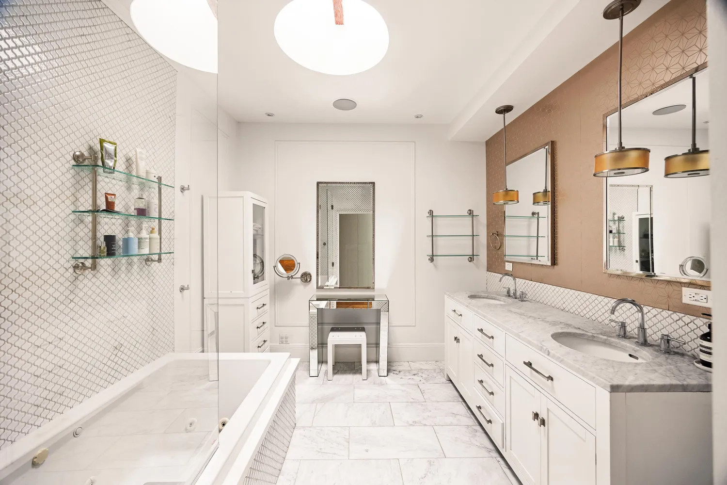The primary suite spans the full width of the home and overlooks the garden. Soaring nearly 11-foot ceilings with exposed beams, custom built-ins, and a full wall of closets create a sense of scale and luxury. The Carrara marble ensuite features a double vanity, soaking tub, and a striking circular skylight intersected by a wood beam—an architectural moment unique to this home.