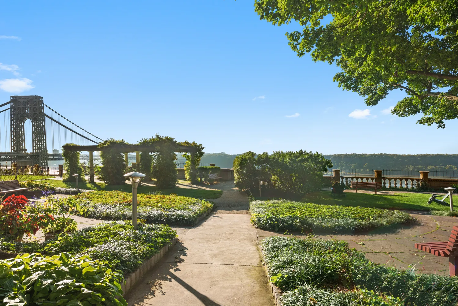 Castle Village is a landmark community spanning seven acres along Cabrini Boulevard, overlooking the Hudson River and George Washington Bridge. Residents enjoy beautifully landscaped gardens with pergolas, Adirondack chairs, walking paths, a playground, and community garden plots. Amenities include a fitness center, indoor playroom, roof deck with panoramic views, parking garage, community room, laundry facilities, storage cages, and bike storage. The pet-friendly, full-service building offers a doorman, live-in superintendent, on-site management, porters, handymen, and 24-hour private security patrols.