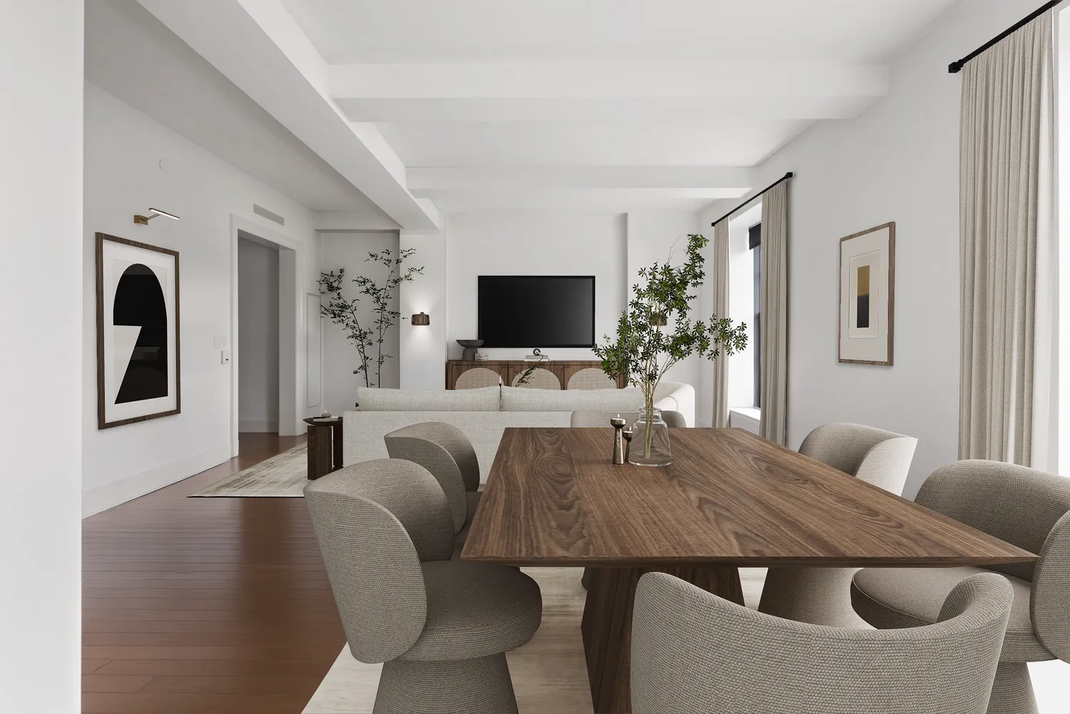 - Gourmet kitchen featuring custom-painted...Nestled within the prestigious Greenwich Lane condominium, this exquisite West-facing three-bedroom, three-and-a-half-bathroom corner residence boasts approximately 2,449 square feet of living space. Crafted by the esteemed interior designer Thomas O’Brien, the interiors showcase a seamless blend of luxury and sophistication.