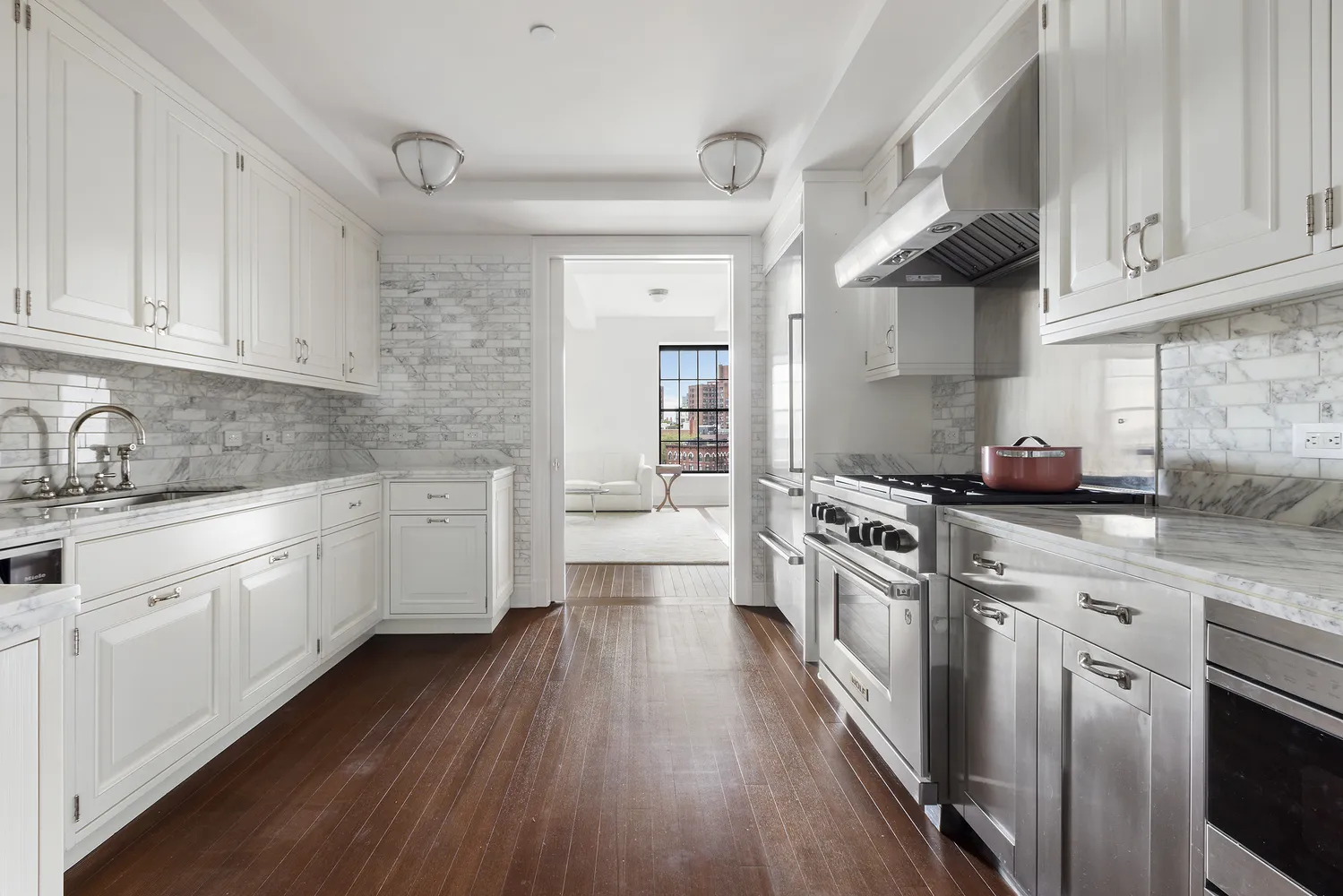 - White marble slab countertops and top-of-the-line appliances, including a Subzero refrigerator and freezer, a Miele dishwasher, a Wolf six-burner range, an oven, and a built-in microwave