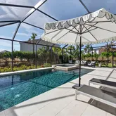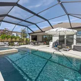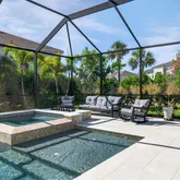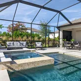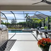Step outside to your private backyard oasis, where luxury truly comes to life. Enjoy a custom-designed pool and spa, a covered outdoor kitchen complete with built-in grill and refrigerator, and an outdoor gas fireplace that transforms evenings into unforgettable experiences. A battery-operated lanai shade on the rear slider enhances comfort, while the expansive screened enclosure creates a resort-style atmosphere ideal for year-round enjoyment.