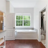 Primary suite with spa-like bath featuring heated whirlpool tub, oversized shower, and walk-in closet