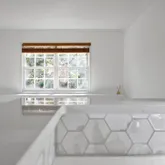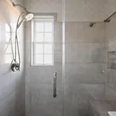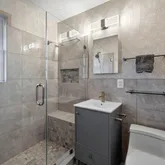recently renovated bathroom (2023) includes a modern shower with a frameless glass shower door, a