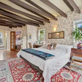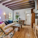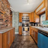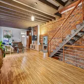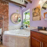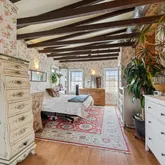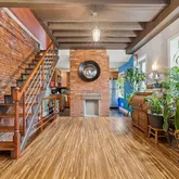 Set back from the street, the home welcomes you with a charming front porch featuring a stunning, one-of-a-kind mosaic art piece set into the exterior as you enter — an immediate hint that this property is truly special. Inside, the sun-filled living and dining areas are rich with character, showcasing exposed brick, original beams, tiger wood bamboo flooring, sconce lighting, soaring ceilings, and a decorative fireplace that anchors the space beautifully. With windows throughout, natural light pours in from every angle.