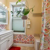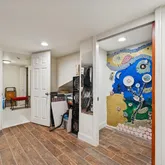 The fully finished lower level offers exceptional additional living space, including a full bedroom/flex room, custom storage, recessed lighting, and a beautifully finished third bath. As you enter the basement, a second custom mosaic adds another artistic touch, reinforcing the unique character woven throughout the home. With a French drain, vapor barrier, and spray foam insulation, this level feels comfortable and fully integrated.