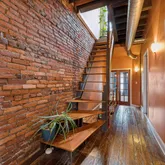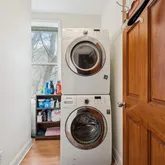 Upstairs, original Douglas Fir floors run throughout the second level. The bright front bedroom features exposed brick details, while the rear bedroom — currently used as an office/ craft room — offers French doors, skyline views, and incredible natural light. A full bath and a convenient second-floor laundry area complete this level.