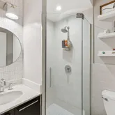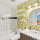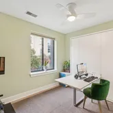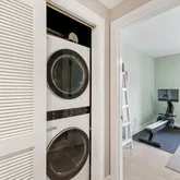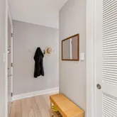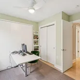 The primary suite is a private retreat, boasting a renovated bathroom, a walk-in closet, and floor-to-ceiling windows that offer views. of trees and 14th Street. The second bedroom includes a custom Murphy bed and ample closet space, with convenient access to another fully renovated bathroom. The thoughtful layout places the bedrooms on opposite ends of the condo for ultimate privacy.