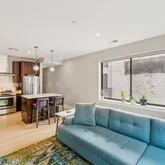 Upon entering, you'll be captivated by the expansive kitchen and living area with walls of windows that flood the space with light. The kitchen is a chef's dream, featuring a Peninsula Island complete with storage and seating, marble countertops and backsplash, and high-end Jenn Air stainless steel appliances. The space is complete with a Fisher & Paykel refrigerator, gas range, built-in microwave, and dishwasher, all complemented by beautiful hardwood floors throughout.