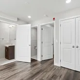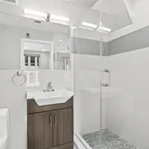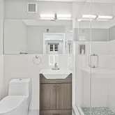 The first-floor bedroom offers a full bath complete with a vanity, separate toilet room, and a stylish frameless glass shower. Conveniently located next to the kitchen is the laundry area, making chores a breeze. Upstairs, the second bedroom offers an en suite bath and a generous walk-in closet for all your storage needs.
