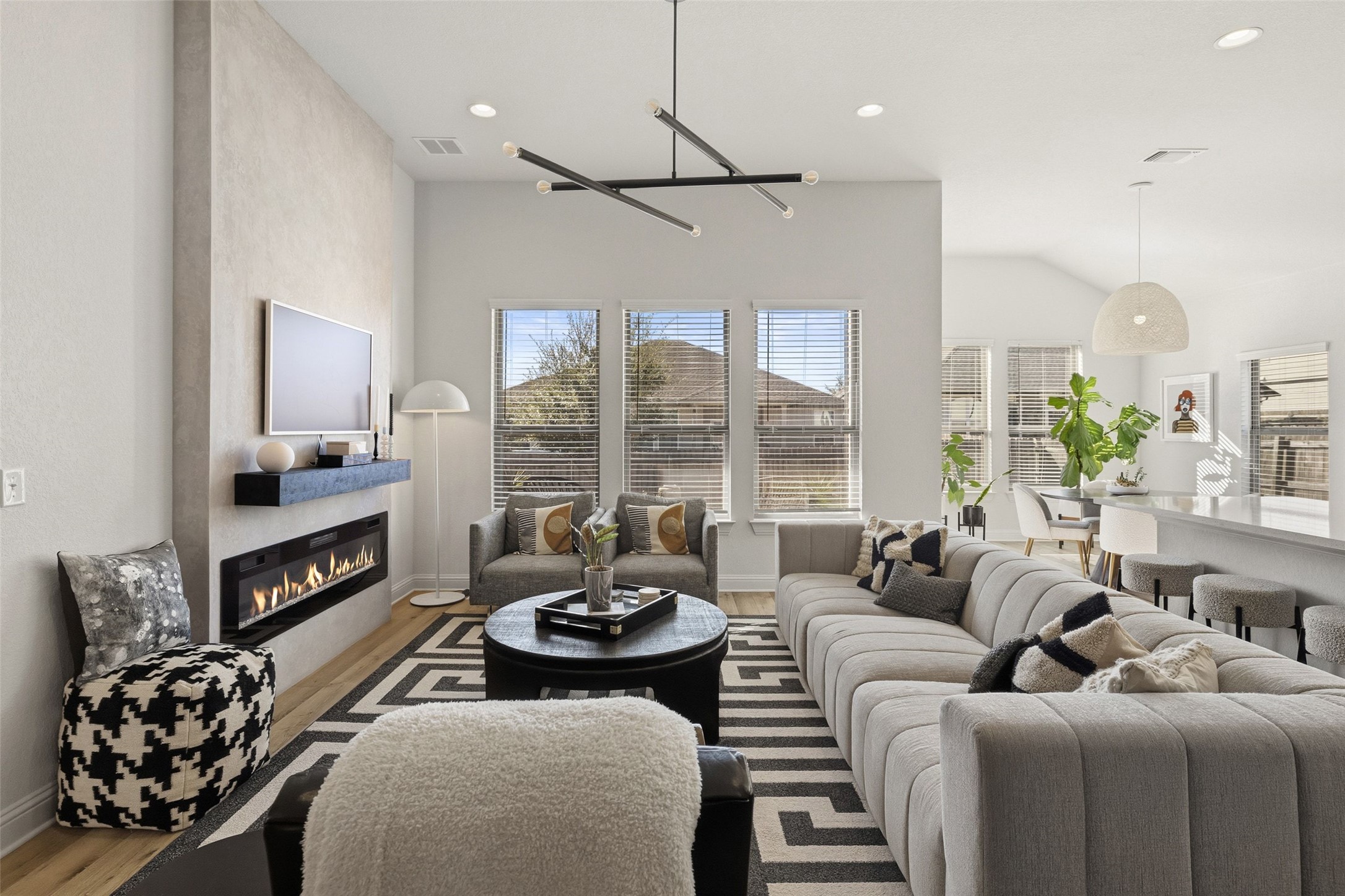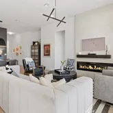 Soaring 11-foot ceilings and an open-concept floor plan create a bright, airy atmosphere, enhanced by Creole Oak luxury vinyl wide-plank flooring throughout the main living areas. The living room is a warm gathering space anchored by a sleek electric fireplace with a plaster-style finish, forming a striking architectural focal point.