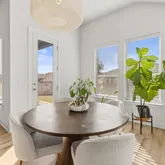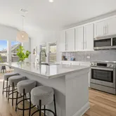 The kitchen connects seamlessly to the living and dining areas, making daily routines and entertaining a breeze. It features white cabinetry, quartz countertops, an oversized island with breakfast bar, induction range, and a grey tile backsplash that complements the cabinets while adding subtle texture and modern flair. A sunny breakfast area opens directly to the covered back patio, creating a natural indoor-outdoor flow ideal for morning coffee, relaxed evenings, or weekend gatherings.