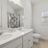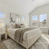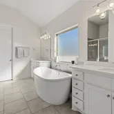 The private primary suite provides a serene retreat, complete with a spa-inspired en-suite bath featuring an oversized walk-in shower, an upgraded freestanding soaking tub, dual vanities, and ample storage. Secondary bedrooms are well-appointed and share a full bath, offering comfort and versatility for guests, family, or additional flex space.