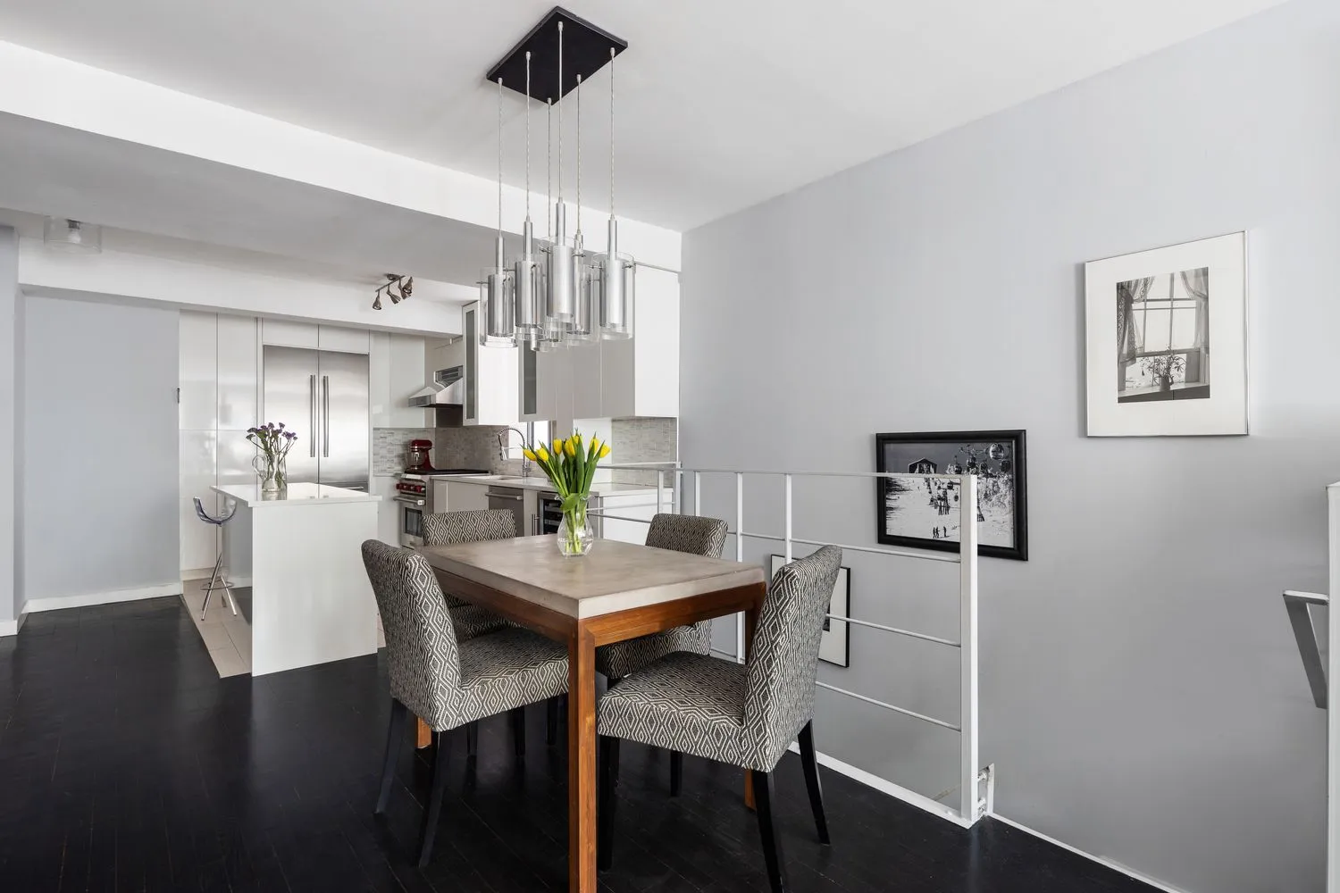 On the primary floor, enjoy open loft-like living and dining. The sleek open windowed kitchen features a large island, premium Wolf and Bosch stainless steel appliances, a wine refrigerator, pantry, caesarstone counters and custom cabinetry.