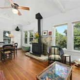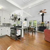 - Room Description: Open kitchen with gas stove, breakfast bar and hardwood floors. Opens up to dining area with wood burning stove.
