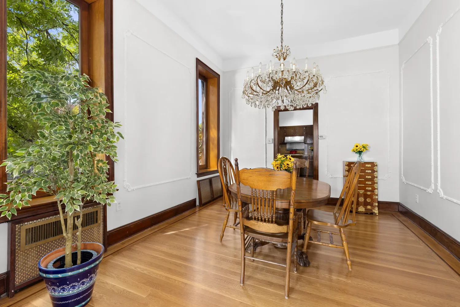 The oversized, windowed, eat-in kitchen is a chef’s dream, with tons of cabinets, two oversized pantries, and a full-size...This huge convertible three-bedroom home (approximately 1,500 sq ft) exudes pre-war charm with soaring 12 ft ceilings, original hardwood floors, and oversized 6+ ft windows that flood the space with natural light. Currently configured as two bedrooms and 1.5 baths, this home features an expansive living and dining area, perfect for entertaining... or for creating your own vision!