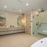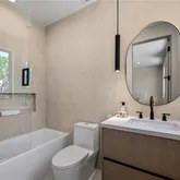 - Room Bathroom Features: Soaking Tub, Quartz Counters, Shower in Tub, Stone Counters, Exhaust fan(s), Walk-in shower, Main Floor Full Bath, Linen Closet/Storage, Separate tub and shower, Double sinks in bath(s), Dual shower heads (or Multiple), Privacy toilet door, Bathtub, Double Sinks in Primary Bath, Vanity area, Shower