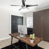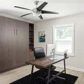 The bright and private primary suite is thoughtfully situated opposite the secondary bedrooms and features an en-suite bath with a large walk-in tile shower and frameless glass doors. One secondary bedroom includes a built-in queen-size Murphy bed with additional storage, offering flexibility for guests or a home office.
