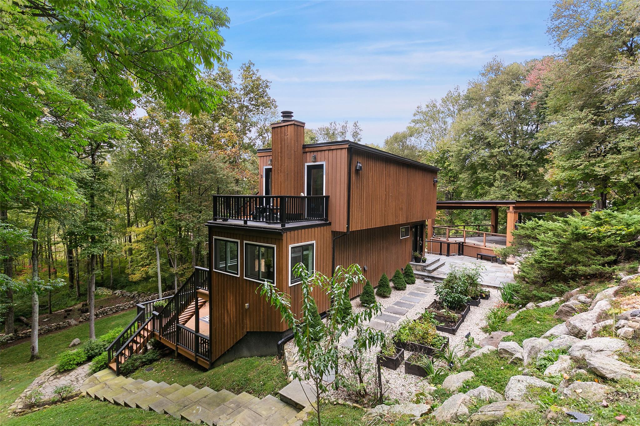 - Exterior Property Features: Garden, Juliet Balcony, Mailbox, In Ground, Deck, Patio, Porch, Floor to Ceiling Windows, Insulated Windows, New Windows, Oversized Windows, Back Yard, Borders State Land, Cleared, Landscaped, Part Wooded, Secluded, Views
