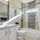• Guest bath with linen closet and porcelain tub surrounded by full tile and glass accents (no fiberglass inserts)
