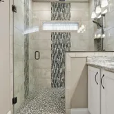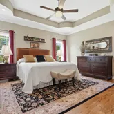 • Primary suite featuring a luxury bath with a flush walk-in shower, dual heads (rain shower & adjustable / removable sprayer with separate controls, tall mirrors, 9-ft. long, custom lava flow, full door vanity tops and separate ladies' vanity
