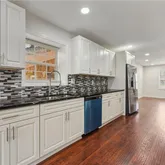 - Kitchen Features: Breakfast Bar, Cabinets White, Eat-in Kitchen, Pantry, Stone Counters, View to Family Room