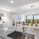 This 9th-floor waterfront condominium at Vanderbilt Surf Colony offers panoramic views of the Gulf of Mexico and Vanderbilt Bay, with sightlines extending toward Sanibel Island. The residence features water views from every room and a private screened lanai overlooking both the Gulf and bay, providing an elevated coastal setting surrounded by natural preserves, boating activity, and wildlife. The open-concept living space includes a redesigned kitchen positioned to maximize water views, with waterfall granite countertops, full-size appliances, high-gloss porcelain flooring throughout, upgraded lighting, and modern fixtures. The living and dining areas open directly to a 24-foot screened lanai suitable for outdoor dining or relaxation. The great room includes a recessed 65-inch Smart TV, custom built-in wall feature, remote-controlled fireplace, and leather dual-reclining seating. The floor plan includes two primary suites located on opposite sides of the residence for privacy. Each suite offers Gulf views, direct lanai access through sliding glass doors, king beds, custom closets, and en-suite bathrooms with walk-in showers and upgraded finishes. Interior Highlights