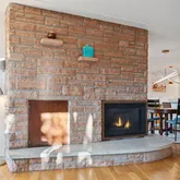 The living/dining room provides a mountain view facing due west through oversized windows. A massive fireplace surround includes a remote-controlled gas fireplace insert. Clad in Lyons bacon-stripe sandstone, it features a ship-curve terrazzo hearth, whose shape is duplicated on the kitchen island countertop.
