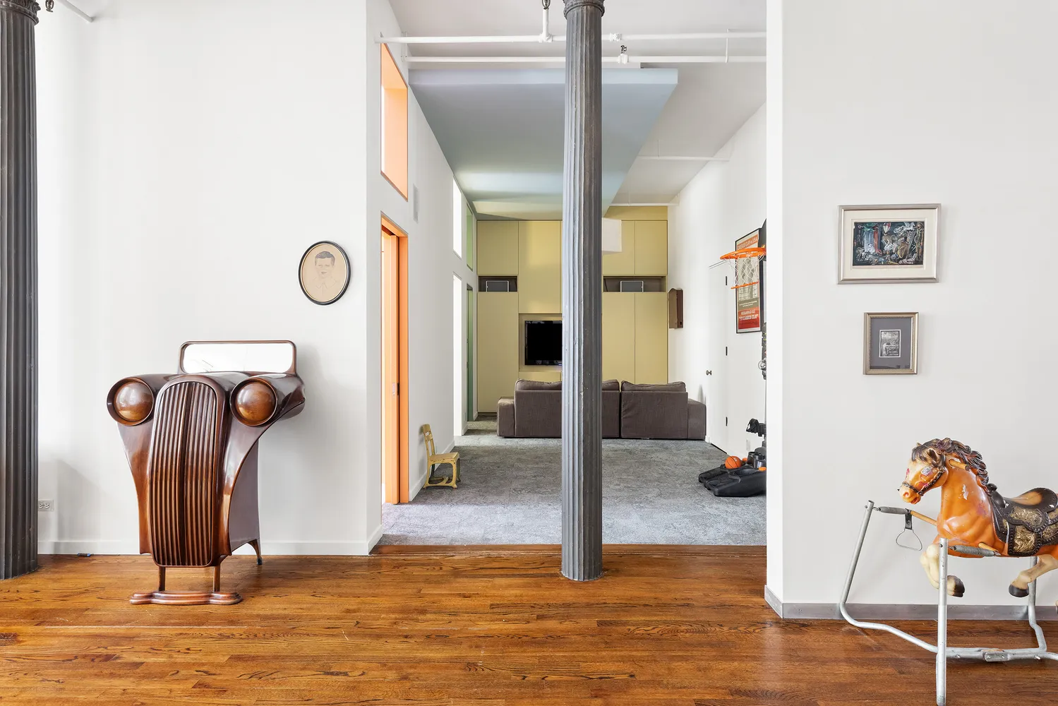 Upon entering through the original steel factory door, you will be greeted by a massive living/dining room adorned with a row of Corinthian columns, complemented by over 12-foot wood-beamed ceilings and an abundance of natural light pouring in through 11 expansive double-hung windows from north to south. The generously sized, windowed kitchen is seamlessly integrated with a floating island, boasting marble countertops, ample cabinetry, and stainless steel appliances.