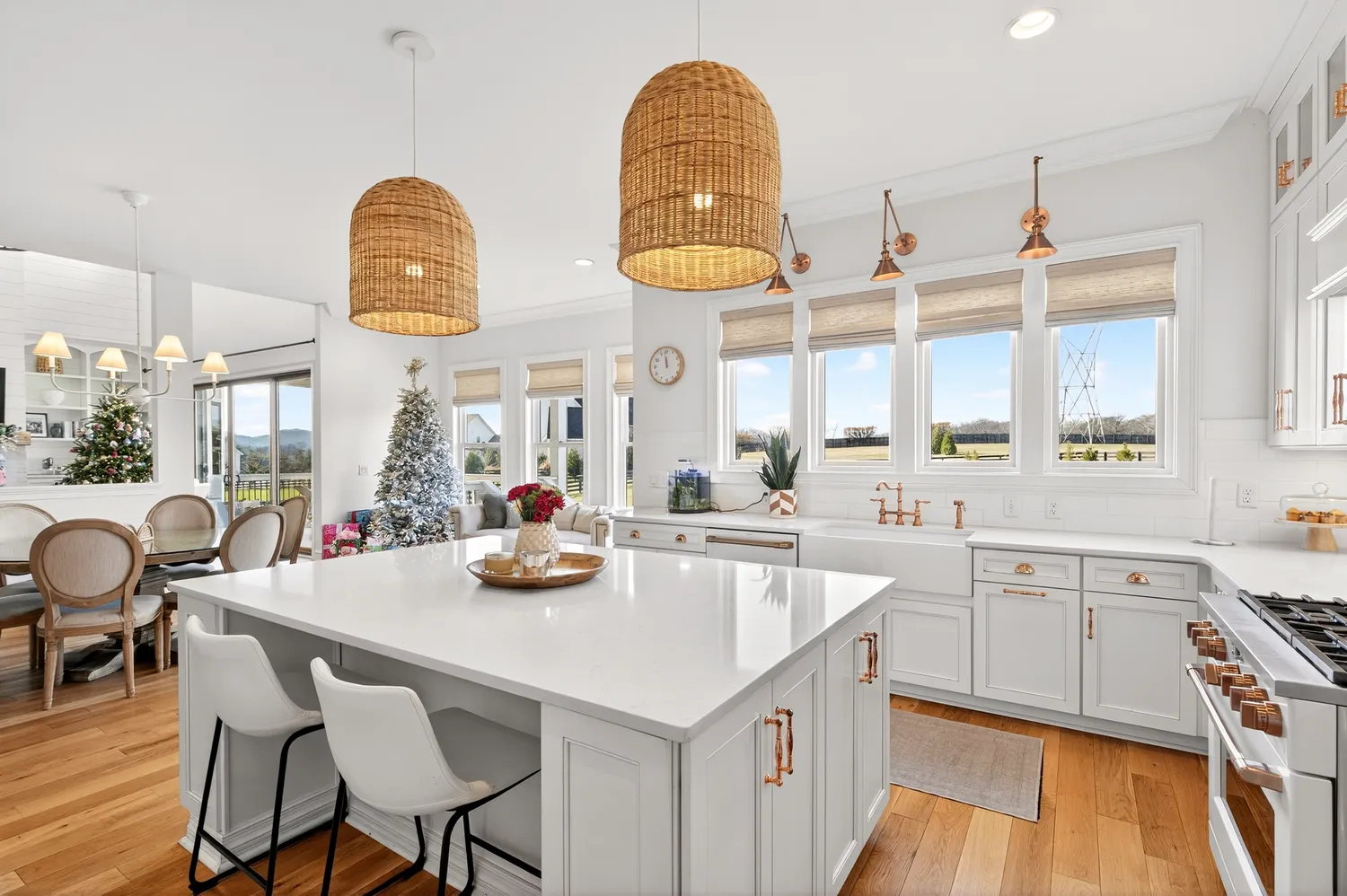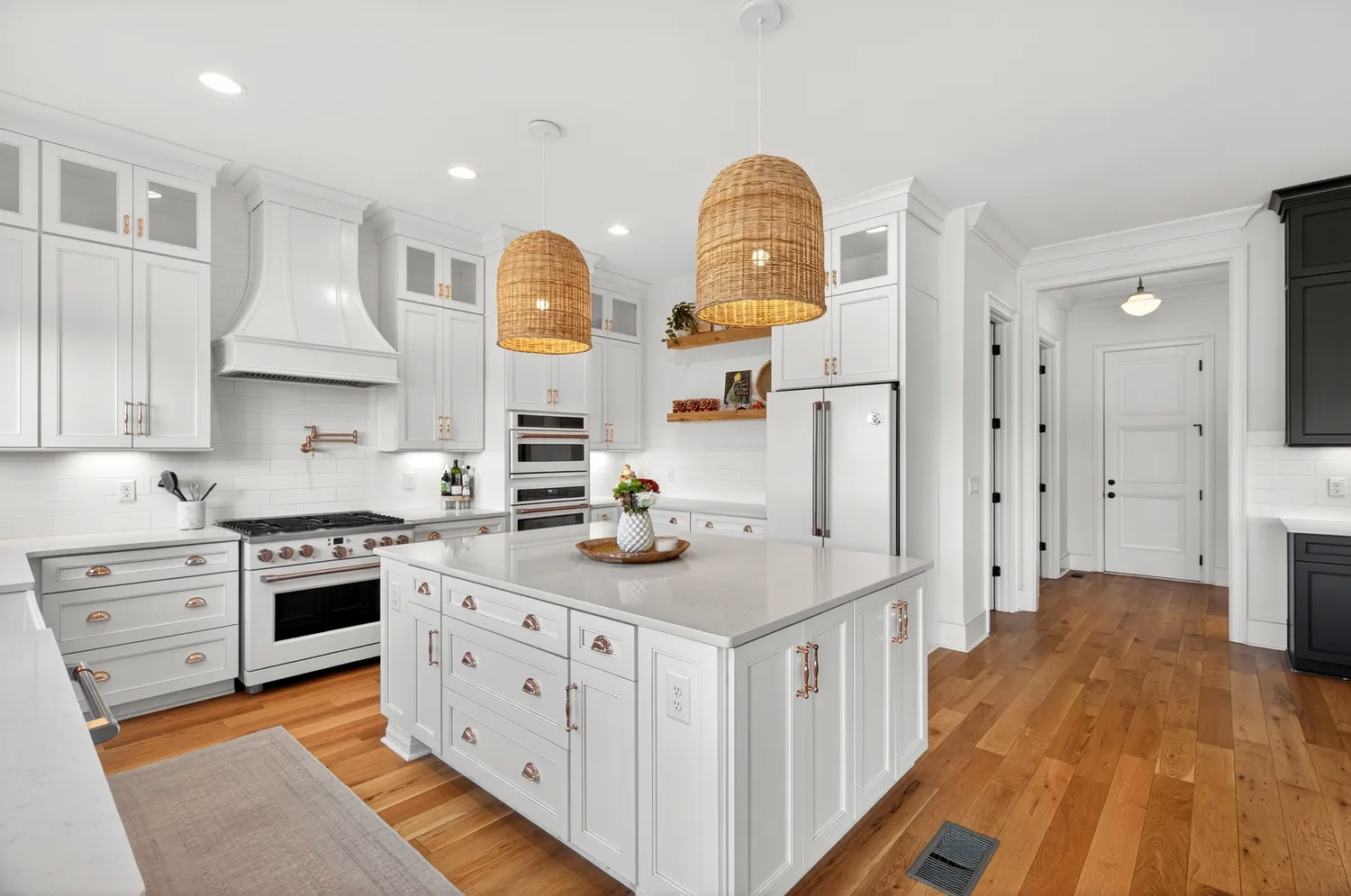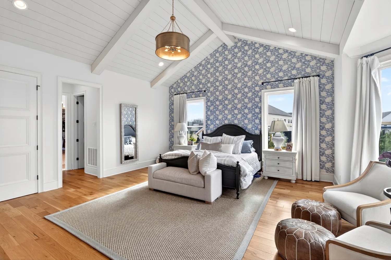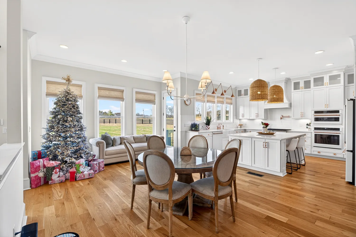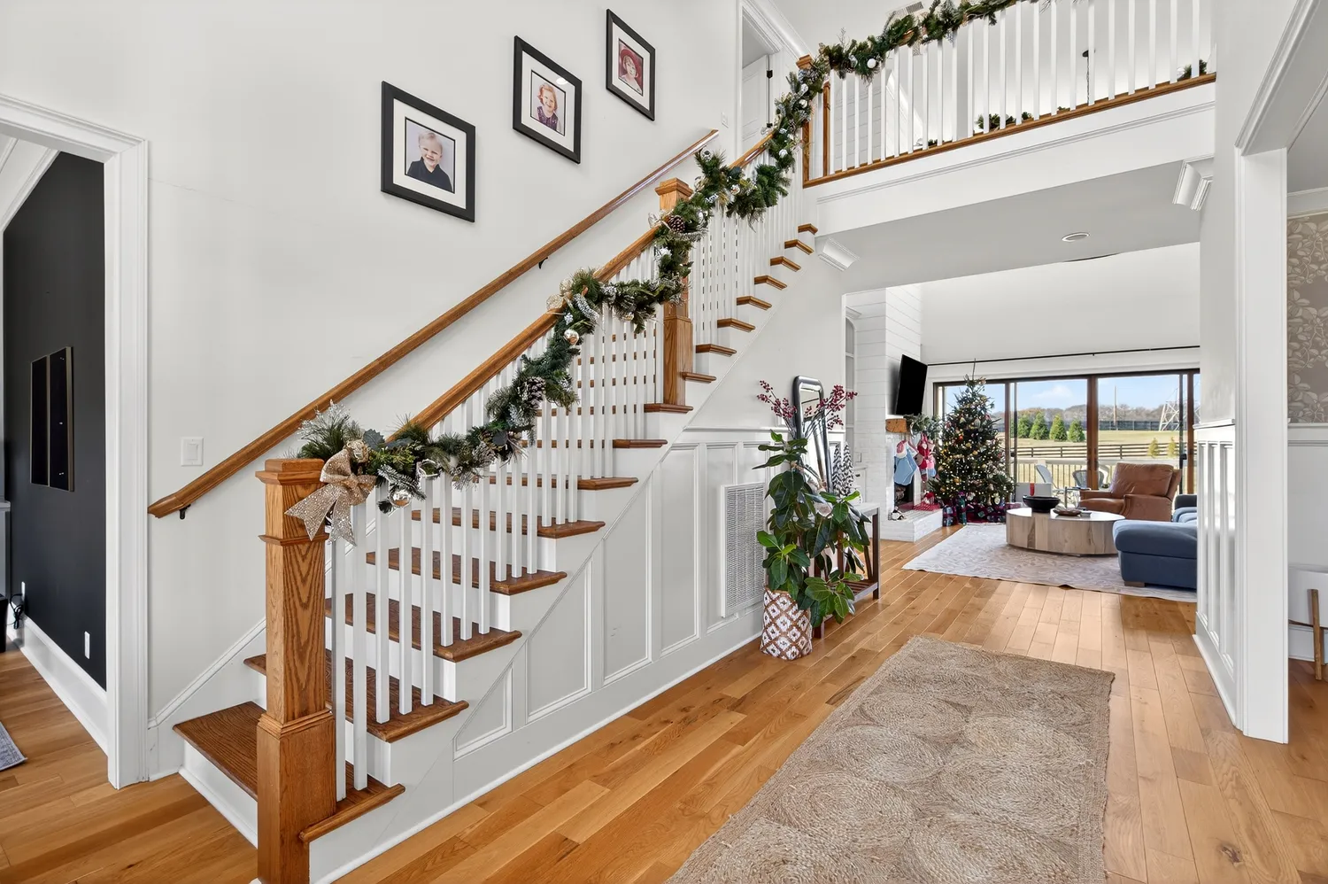Situated on over an acre in the quiet Swansons Ridge cul-de-sac community, the home features peaceful pastoral views and refined architectural details throughout. A welcoming front porch opens to a light-filled foyer with wide-plank hardwood floors and a striking staircase. A private home office with custom built-ins and accent walls provides an ideal work-from-home space.