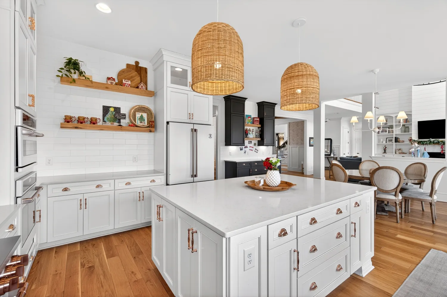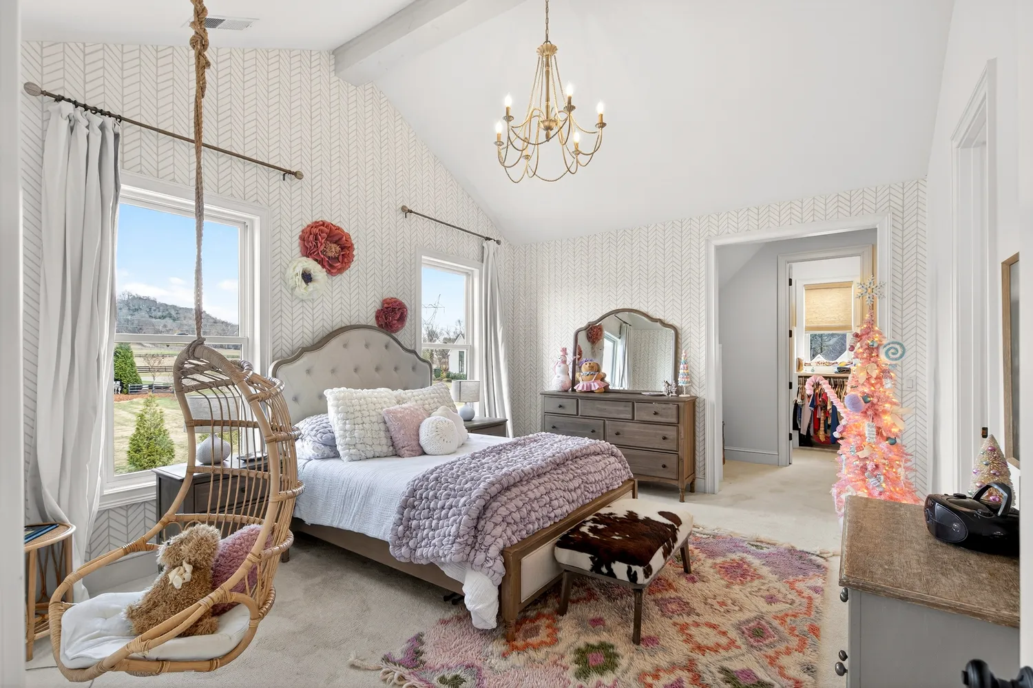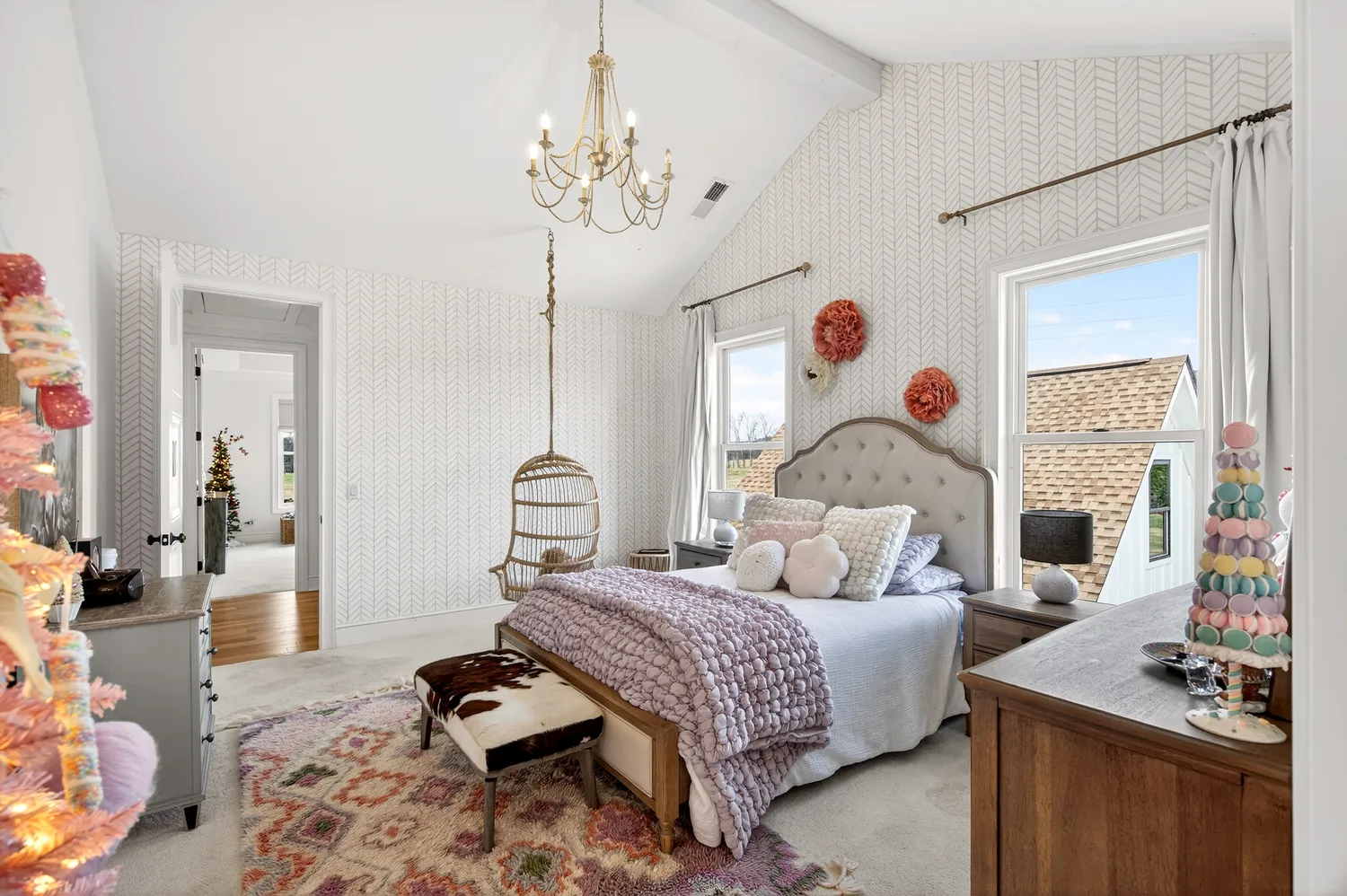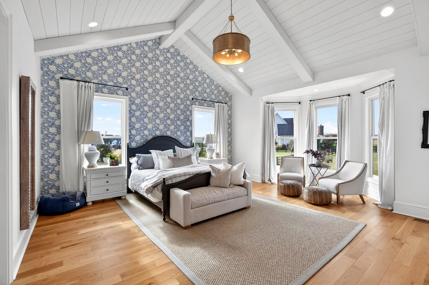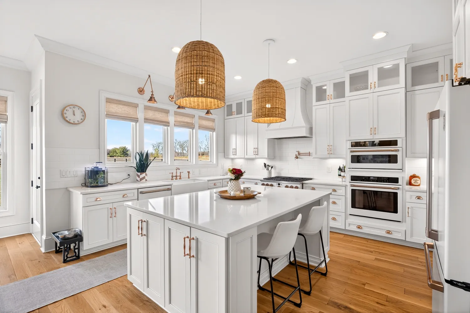 Situated on over an acre in the quiet Swansons Ridge cul-de-sac community, the home features peaceful pastoral views and refined architectural details throughout. A welcoming front porch opens to a light-filled foyer with wide-plank hardwood floors and a striking staircase. A private home office with custom built-ins and accent walls provides an ideal work-from-home space.