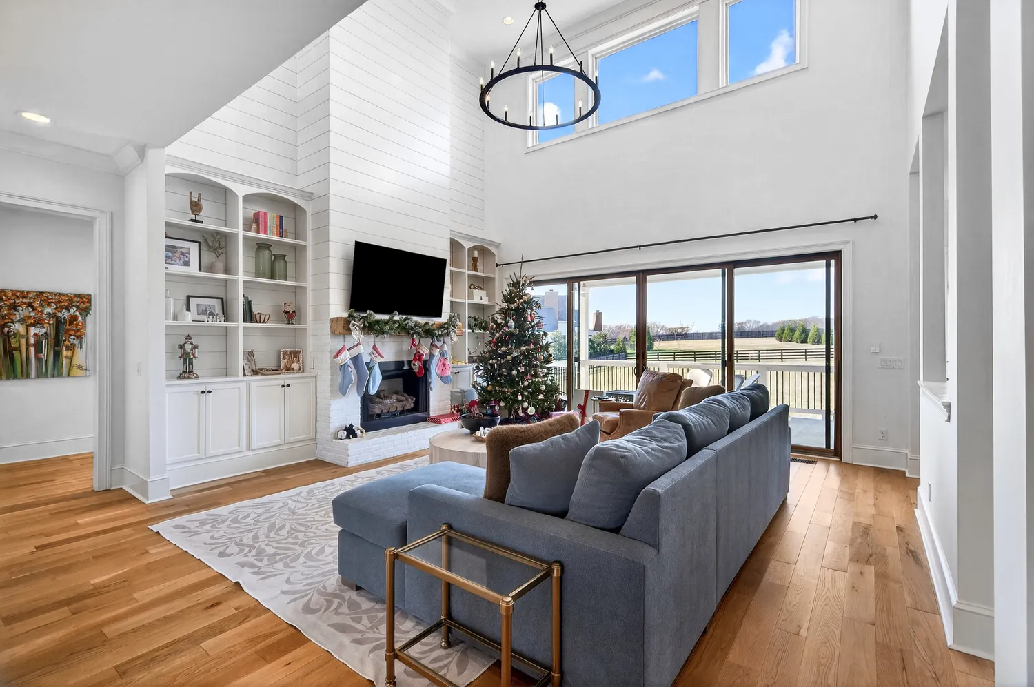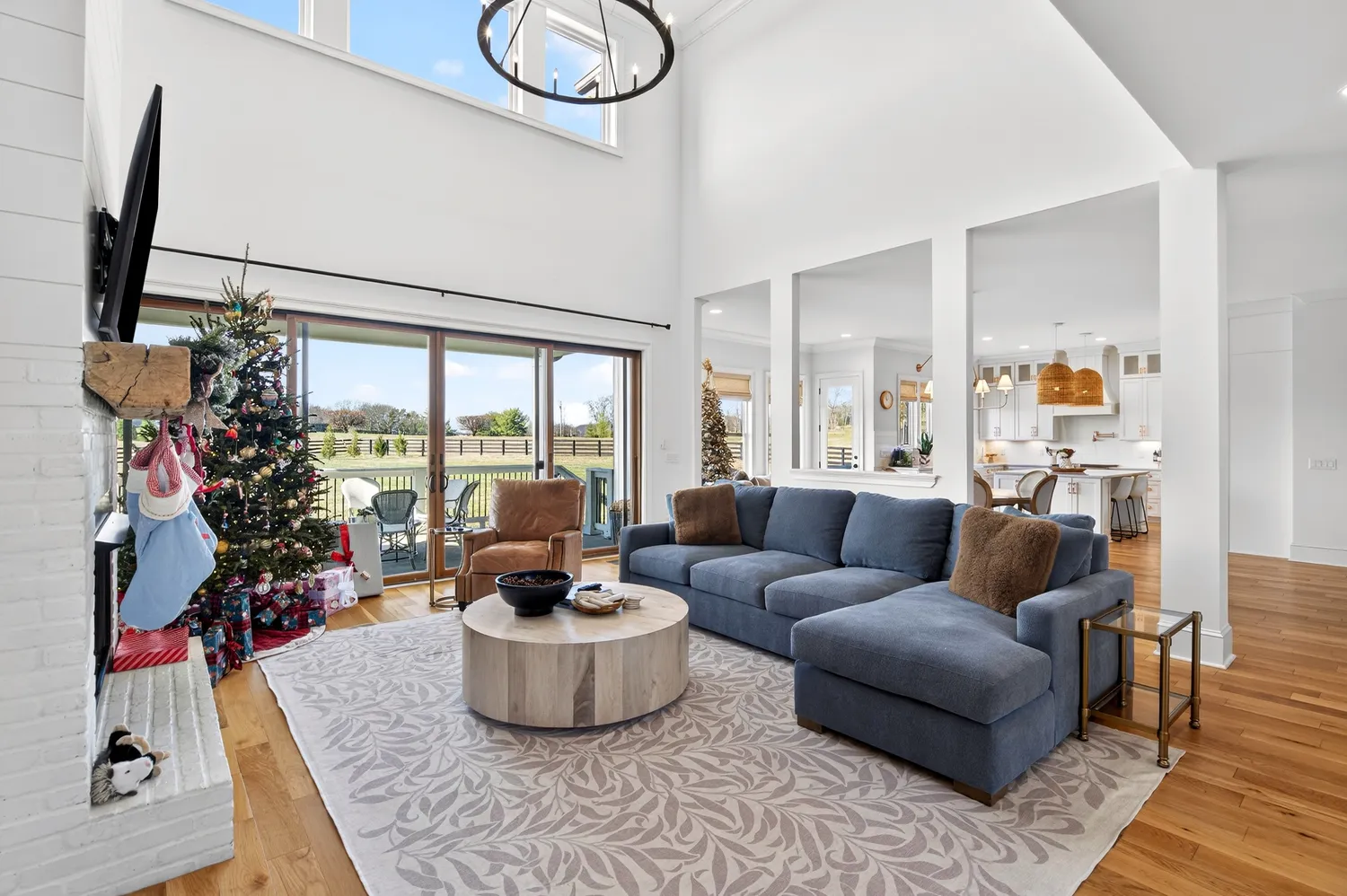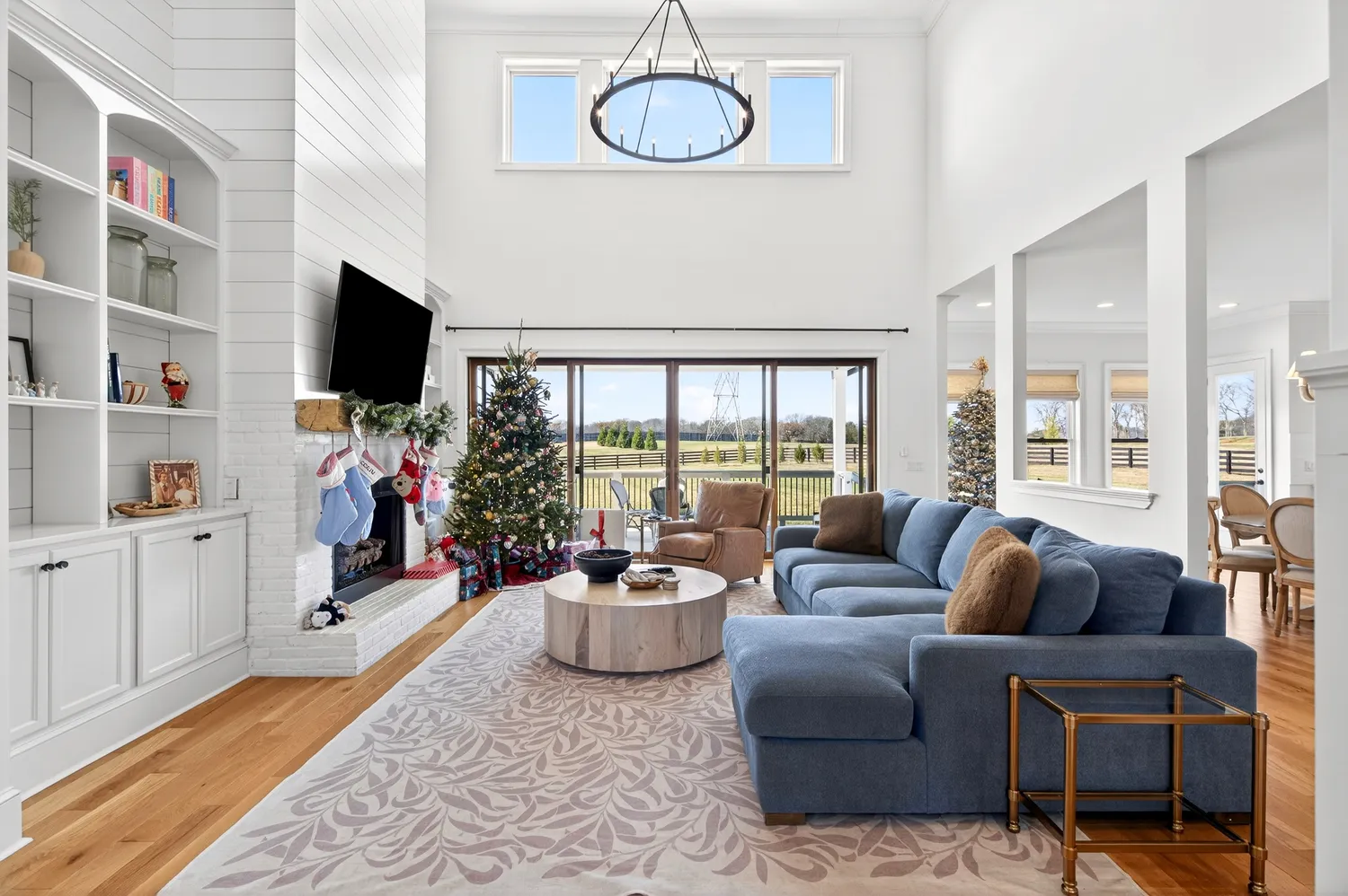 The main living area showcases soaring ceilings, a shiplap fireplace with built-ins, and expansive sliding doors that open to the covered back porch. The open-concept layout flows into the dining area with vaulted ceilings and exposed beams, while the kitchen offers Café appliances, custom hardware, and abundant storage.