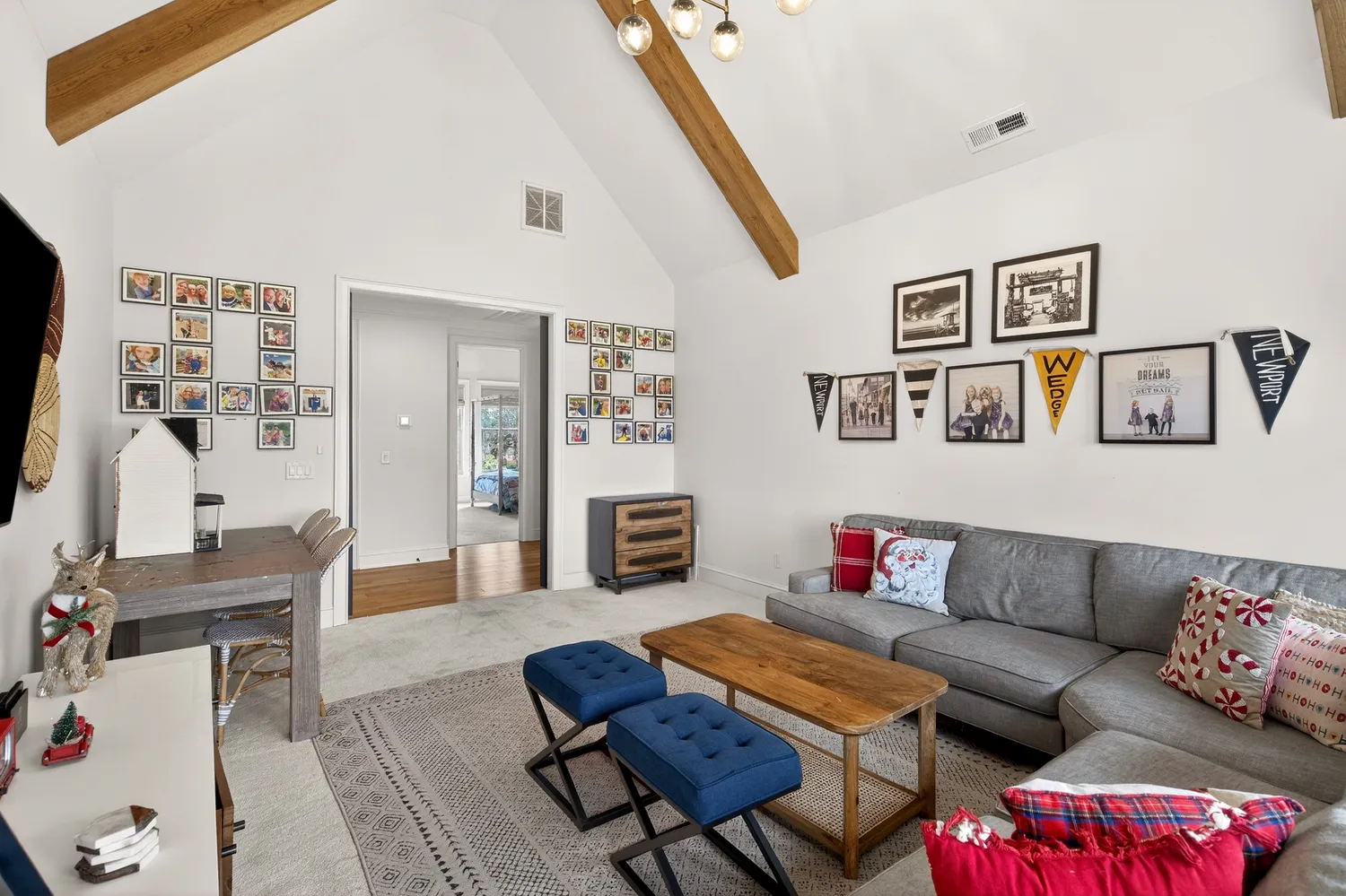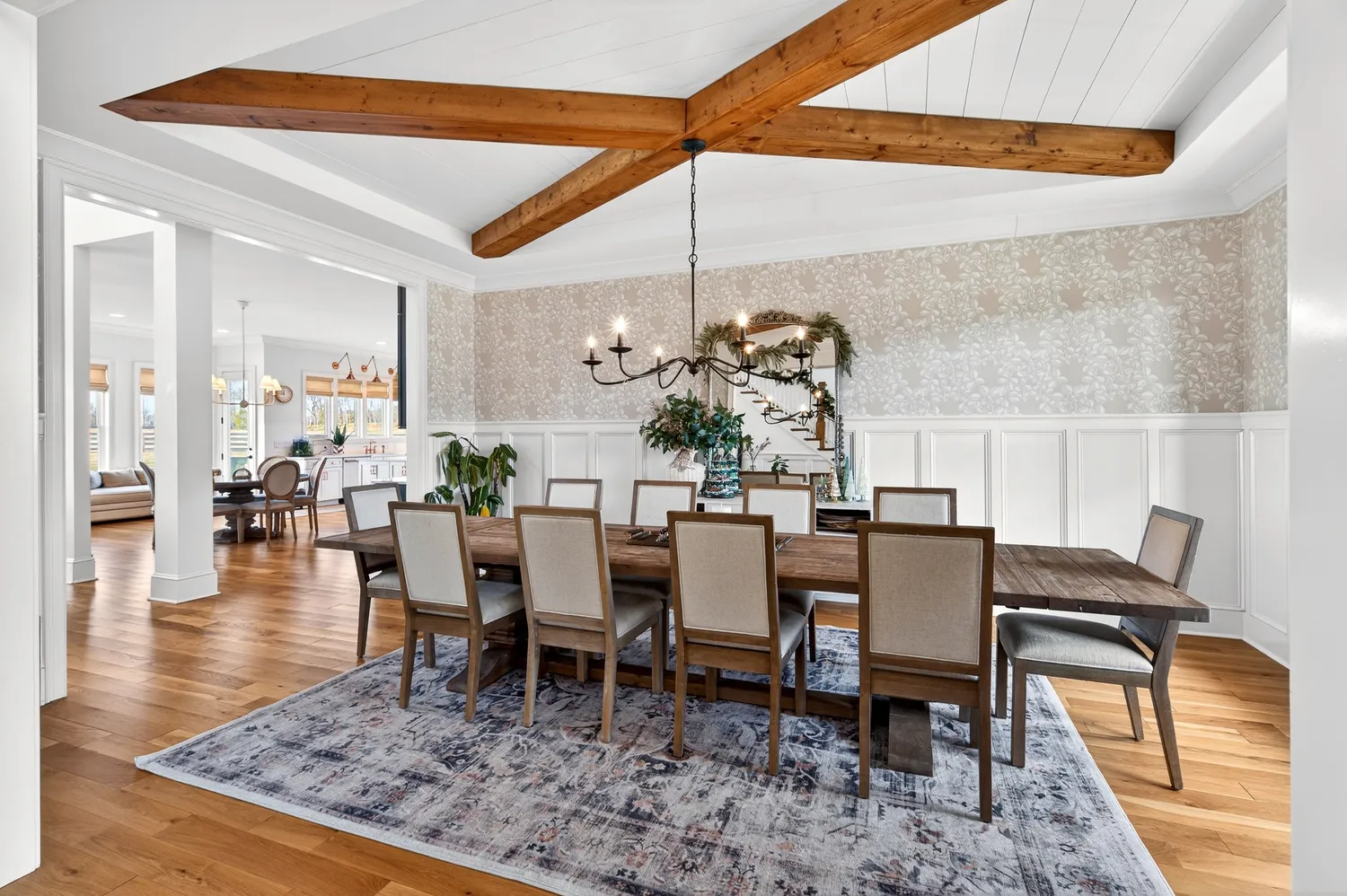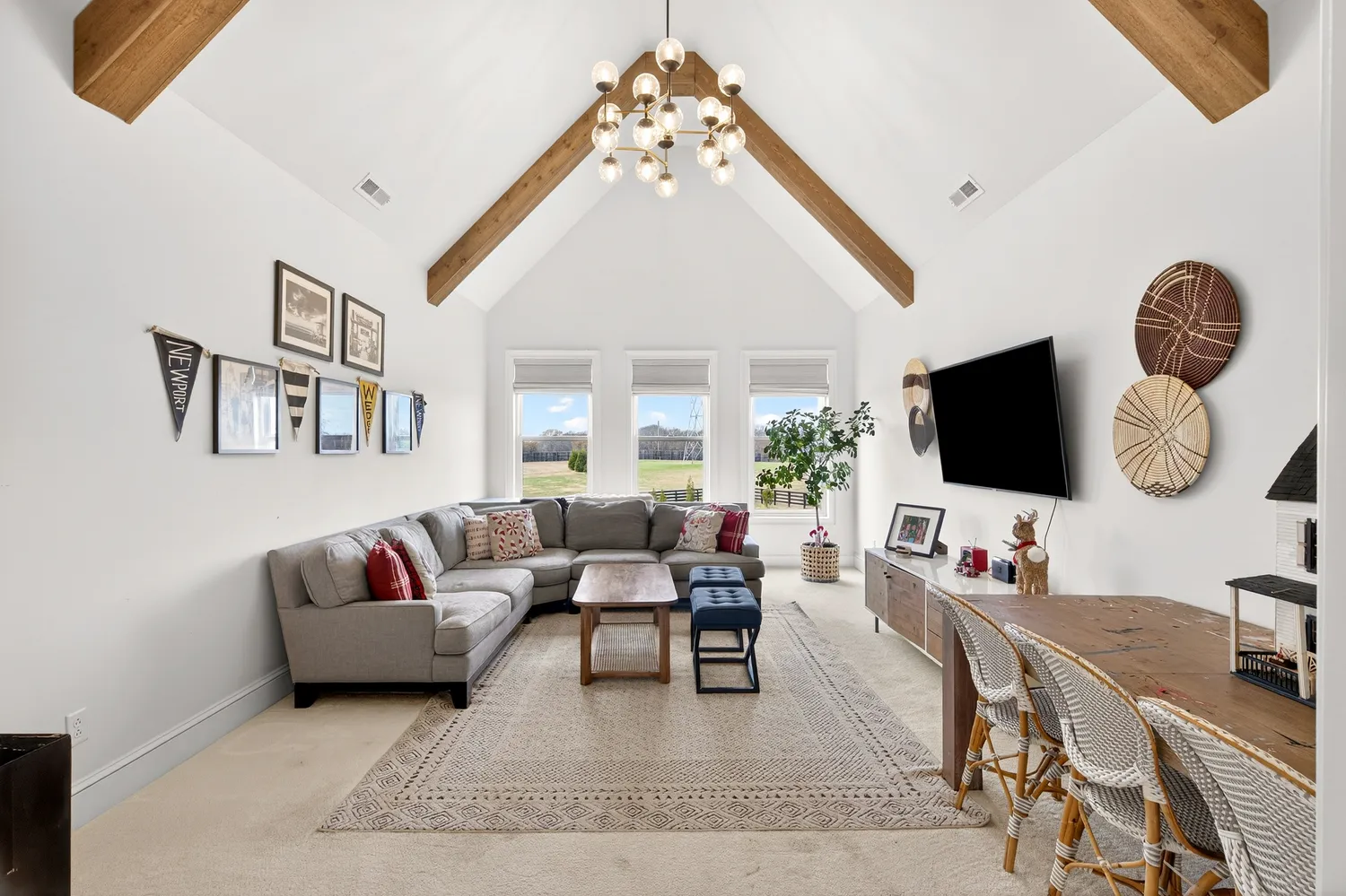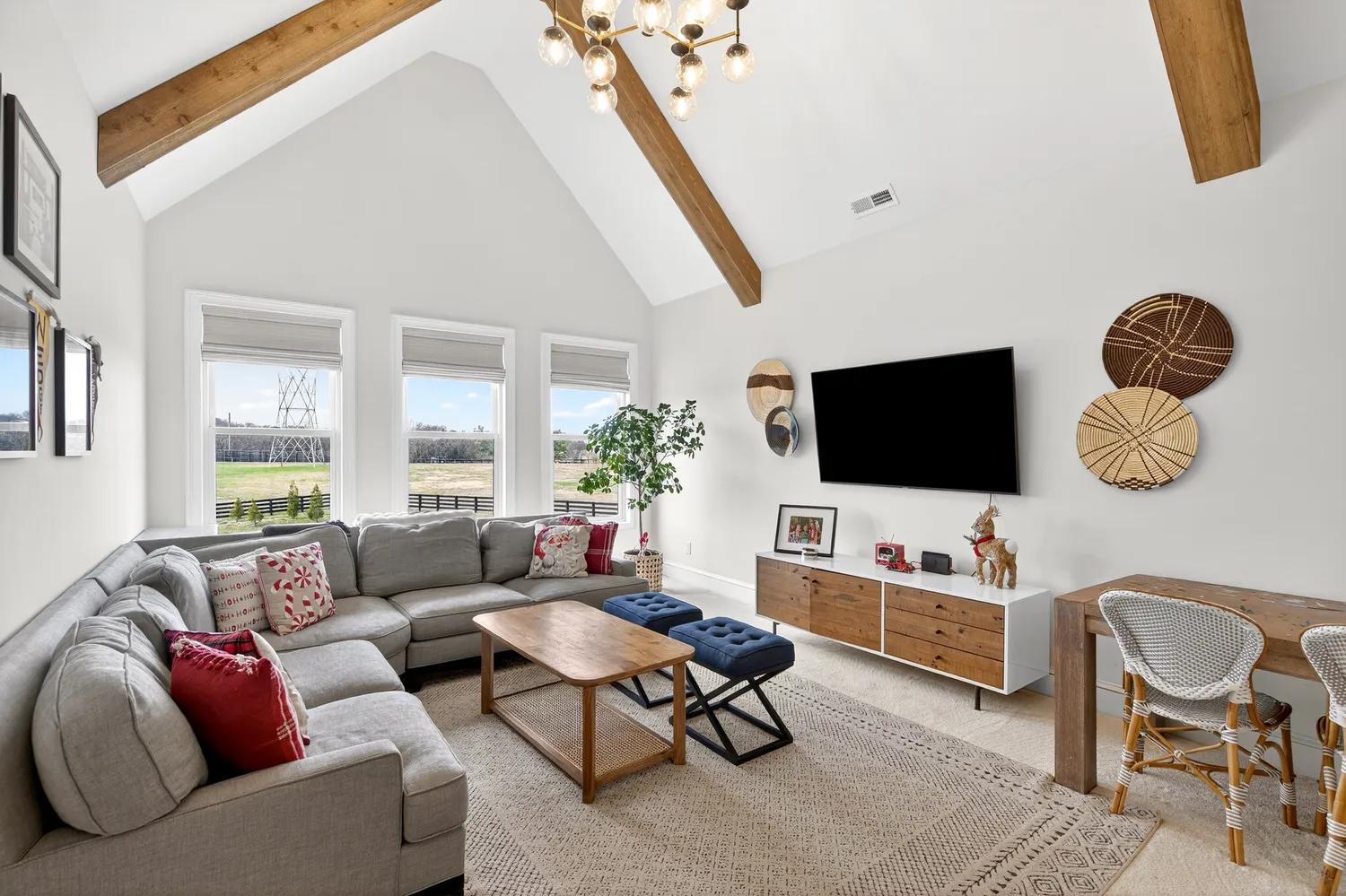 The main living area showcases soaring ceilings, a shiplap fireplace with built-ins, and expansive sliding doors that open to the covered back porch. The open-concept layout flows into the dining area with vaulted ceilings and exposed beams, while the kitchen offers Café appliances, custom hardware, and abundant storage.