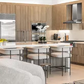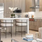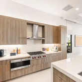 The kitchen is a masterpiece- equal parts architecture and culinary theater. Cambria Ironsbridge Quartz glows softly across the waterfall island, while a suite of Wolf and Sub-Zero appliances, including a steam oven, stands ready for the ambitious cook or catered event. Frameless custom cabinetry rises elegantly concealing storage that has been thoughtfully planned down to the smallest detail, including custom pullout sliding shelves. Every surface feels handcrafted; every choice, elevated.
